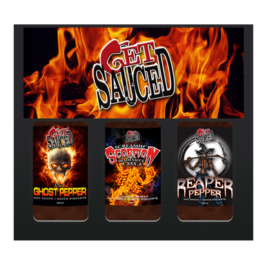 Black Gift Pack with our 3 Hottest Sauces 1 Ghost Pepper Sauce 1 Scorpion Pepper Sauce 1 Reaper Pepper Sauce