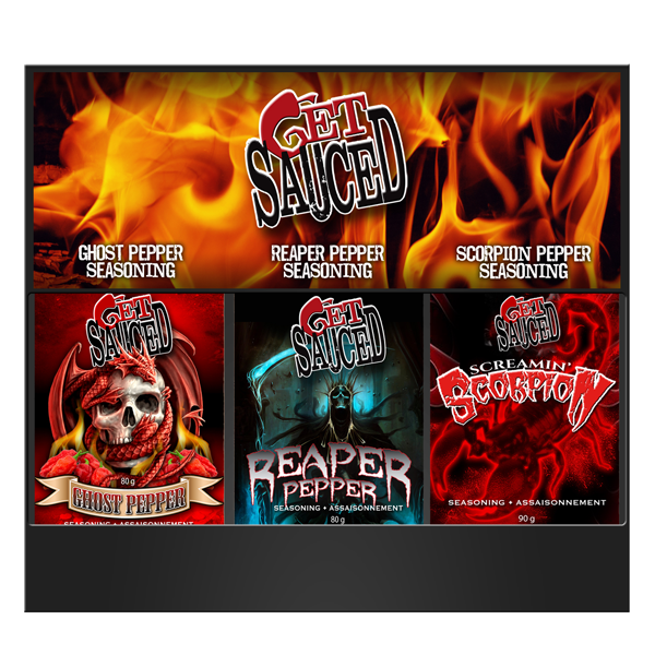 This 3 pack contains our 3 hottest seasoning. From Ghost Peppers, Scorpion Peppers and also includes the worlds hottest Carolina Reaper. All 3 are seasoning blends that go amazing on anything from steak and chicken wings, to fajitas and fish. If you want to heat up movie night, crush some reaper popcorn!